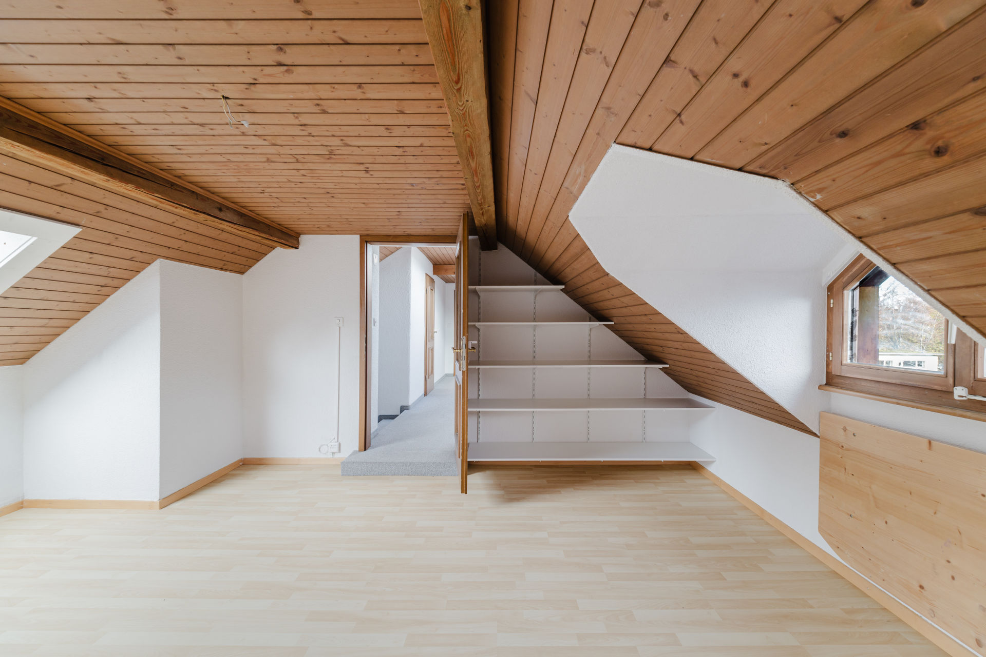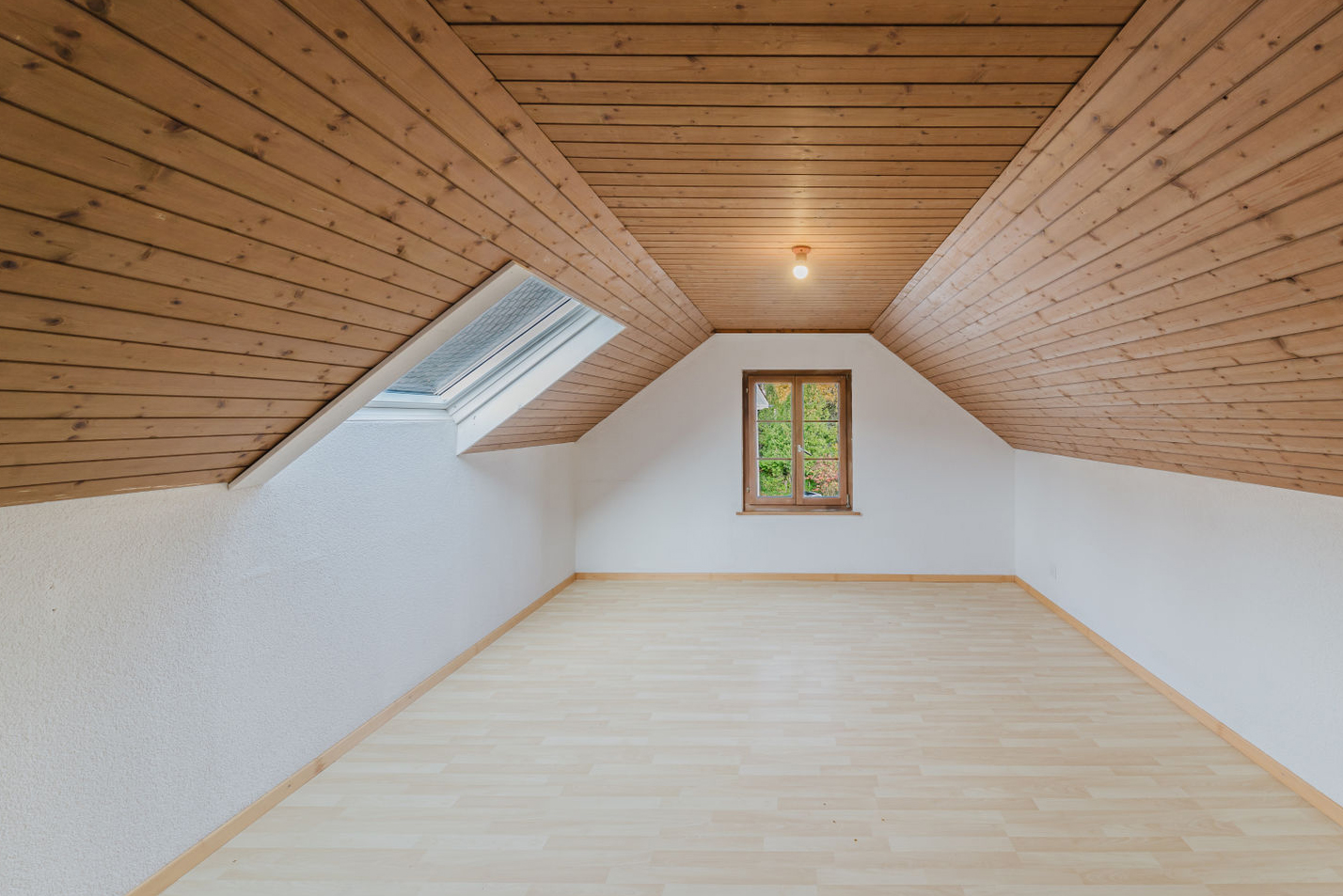 Vom Wohnzimmer führt eine Treppe ins Dachgeschoss. Hier befinden sich zwei weitere Schlafzimmer, sowie ein zweites Bad mit Dusche, WC und Lavabo.